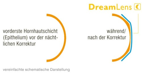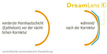 Sie kann mehr als normale Tages- oder Monatsaustausch-Kontaktlinsen: Im Tausendstel-Millimeterbereich bringt DreamLens die obere Schicht des Auges in einen für scharfes Sehen idealen Zustand. Dabei folgt sie der Sogwirkung des Tränenfilms, die durch die Kontaktlinse gesteuert wird. Weil die Schicht viskoelastisch ist, verharrt sie in der veränderten Position und wird – mindestens für 16 Stunden – zu einer quasi körpereigenen Korrekturlinse. Danach kehrt die Hornhaut langsam in ihre Ausgangsform zurück.